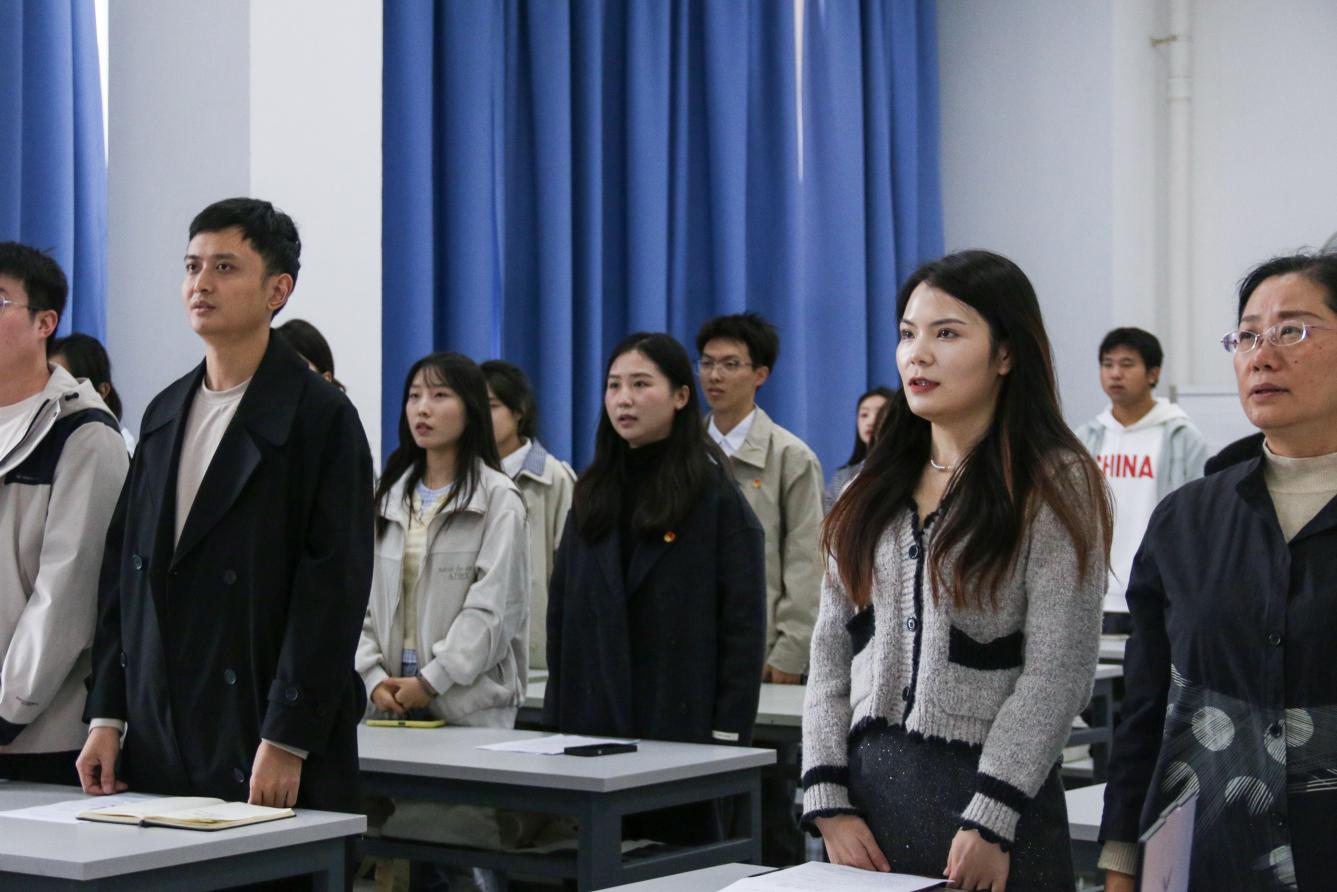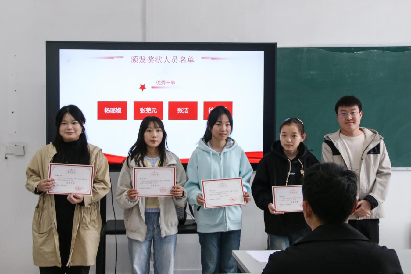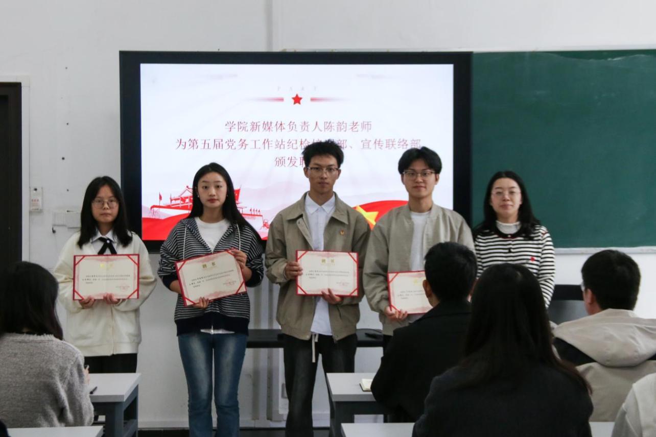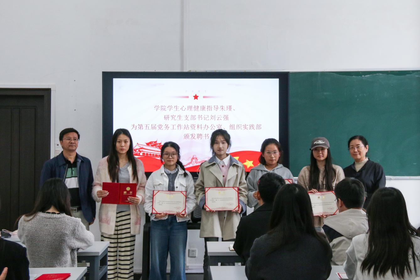 全体参会人员齐唱国歌后大会正式开始。首先由党务工作站副站长胡芮介绍参加此次会议的嘉宾,随后分别由学院就业创业指导老师黄欣为第五届优秀干事颁发荣誉证书、学院学生工作办公室主任李阳为第五届党务工作站优秀学生干部颁发奖状、学院新媒体负责人陈韵为纪检培训部及宣传联络部学生干部颁发聘书、学院学生心理健康指导老师朱瑾与研究生支部书记刘云强为组织实践部及资料办公室学生干部颁发证书。最后,由学生党委副书记熊必刚老师为第五届党务工作站站长颁发聘书。