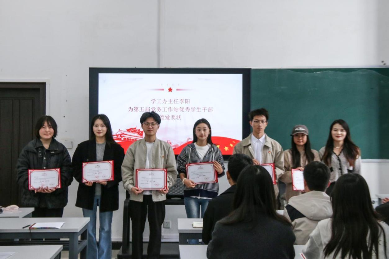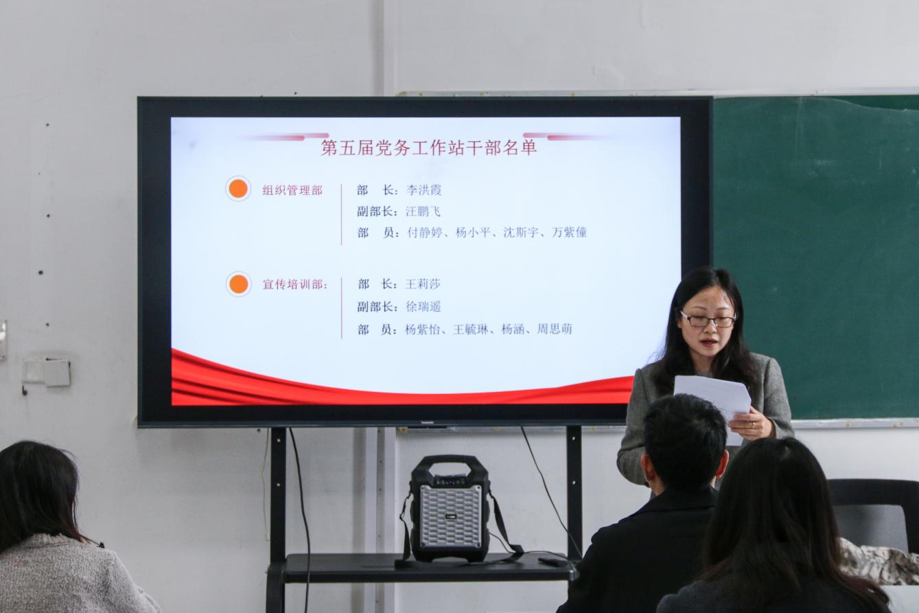 学院专职组织员李雪佳老师宣读第六届党务工作站学生干部名单。会上,李雪佳老师对上一届党务工作站同学的工作表示肯定,也对新一届党务工作站的全体同学提出了要求与展望,希望新一届的成员以高度的责任感落实党务工作站的任务,把党务工作站建设得更有凝聚力,更有战斗力。