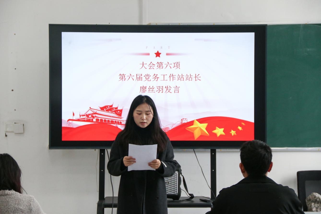 随后由第六届党务工作站站长廖丝羽同学发言,廖丝羽同学首先感谢了老师与同学们的信任,表示自己将做好党务方面工作的决心,带领成员们取得优异的成绩,并作出了未来的工作规划。