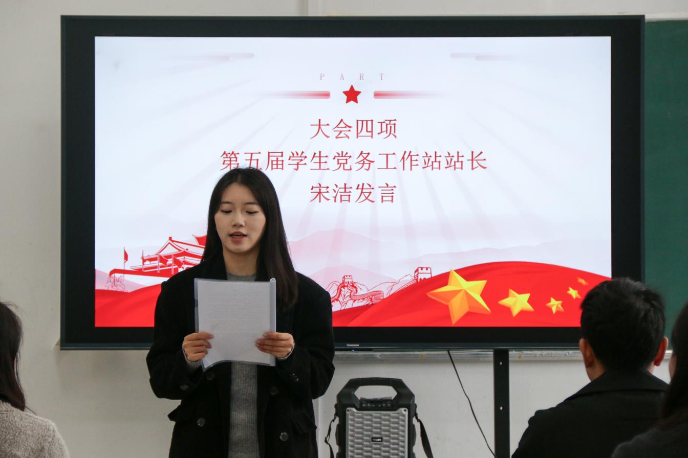 时序更替,华章日新。第五届党务工作站站长宋洁同学代表上一届党务工作站全体成员作工作总结报告。她系统回顾了过去一学年中党务工作站在思想引领、组织建设与党员服务等方面开展的主要工作及取得的丰硕成果,同时也对新一届党务工作站成员表示祝贺与期待。