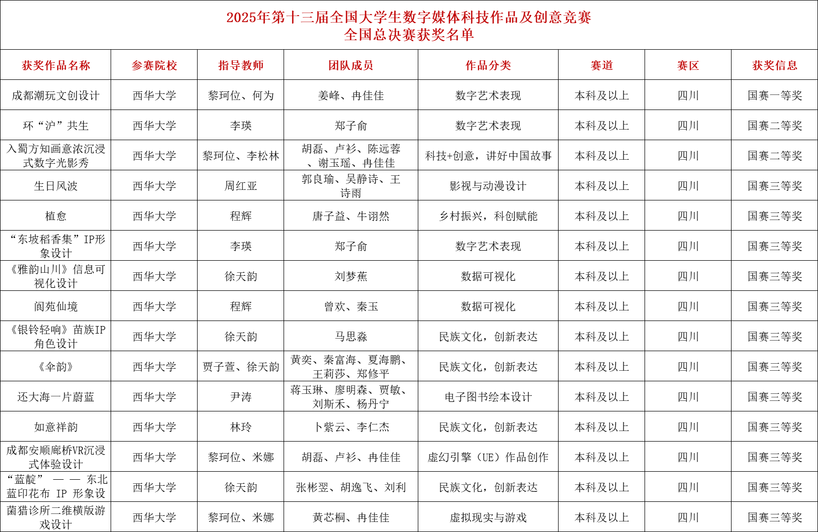 近日,2025年第十三届全国大学生数字媒体科技作品及创意竞赛全国现场总决赛在哈尔滨圆满落幕。全国大学生数字媒体科技作品及创意竞赛是由中国人工智能学会等主办的全国普通高校大学生A类竞赛。本次赛事,全国共50万学生参加,提交17万件作品;参加总决赛的队伍达到1900支,合计4800余人。美术与设计学院师生在此次竞赛中表现优异,共斩获国家级一等奖1项、国家级二等奖2项,国家级三等奖12项,充分展现出各专业在数字媒体科技领域的创新活力和扎实的专业素养。视觉传达设计系黎珂位、李松林、李瑛老师获优秀指导教师。