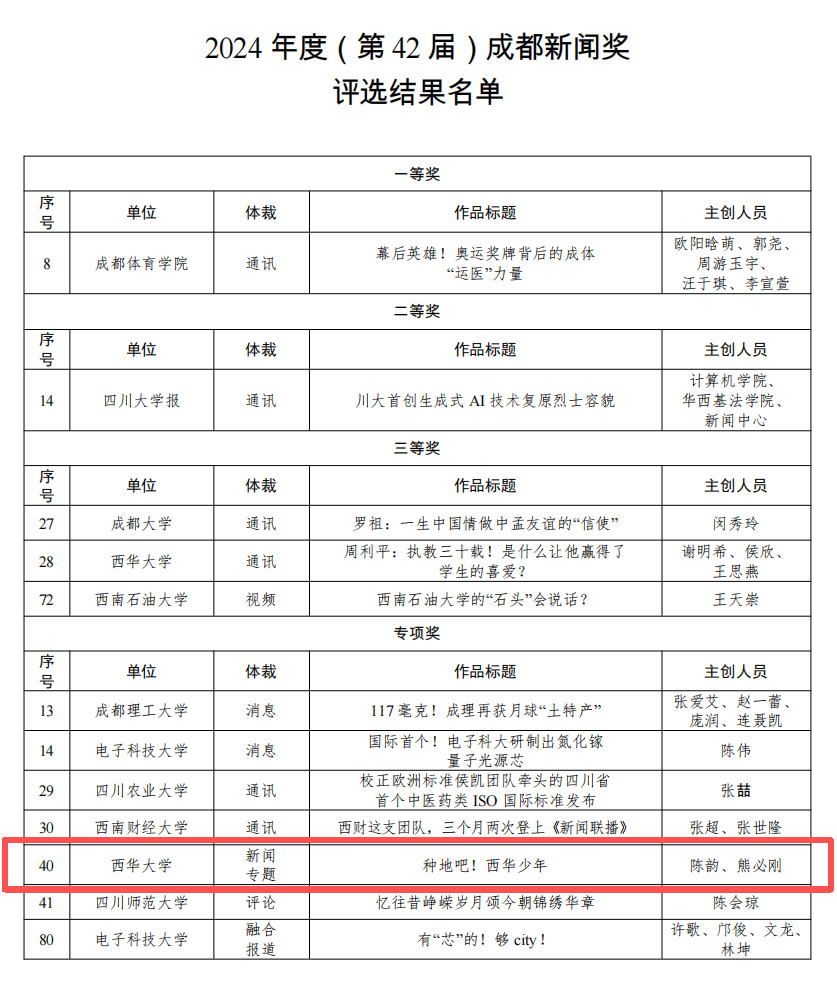 近日,2024年度(第42届)成都新闻奖评选结果揭晓。我院新闻专题作品《种地吧!西华少年》(作者:陈韵 熊必刚)凭借其独特的视角和深刻的主题,从众多参选作品中脱颖而出,荣获专项奖。本届成都新闻奖高校序列共评选出一等奖1项、二等奖1项、三等奖3项,专项奖7项,竞争异常激烈。此次获奖是对我院新闻宣传工作阶段性成果的肯定与认可,也将激励着我们继续砥砺前行。