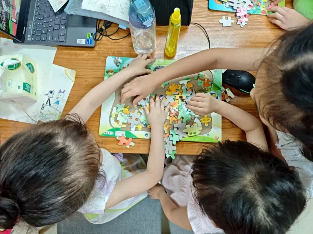 实践团精心策划“家国共育”主题活动,让爱国教育变得生动可感。活动以 “小行动,大改变”为核心,设计系列沉浸式体验。孩子们化身“爱国小宣讲员”,讲述邻居老兵的勋章故事、社区志愿者的坚持;在“画笔绘山河”环节,用色彩描绘长城、火箭、田野等;通过拼图游戏明白“祖国就像大拼图,每块土地都重要”;还亲手制作感恩卡,向环卫工人、老师、父母等表达敬意。