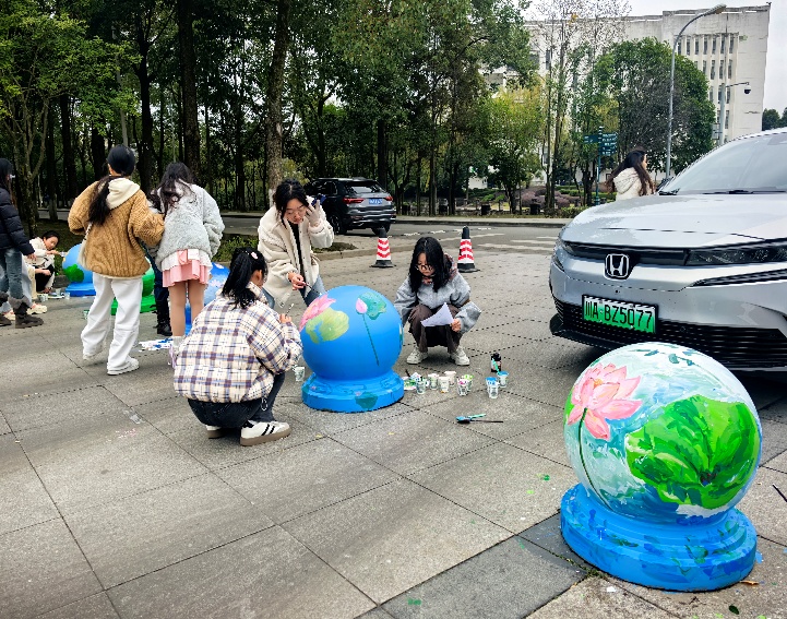 路过的师生纷纷驻足围观,设计专业的李同学一边细致勾勒莲蓬的纹路,一边笑着说:“平时在画室里画设计图,这次能在石墩上创作,把专业技能用在美化校园上,感觉特别有意义。看着光秃秃的石墩在自己手里变得这么漂亮,成就感满满!”现场不时传来阵阵笑声,画笔摩擦石墩的沙沙声、同学们的讨论声、路师生的赞叹声,交织一首动听的校园创意交响曲。