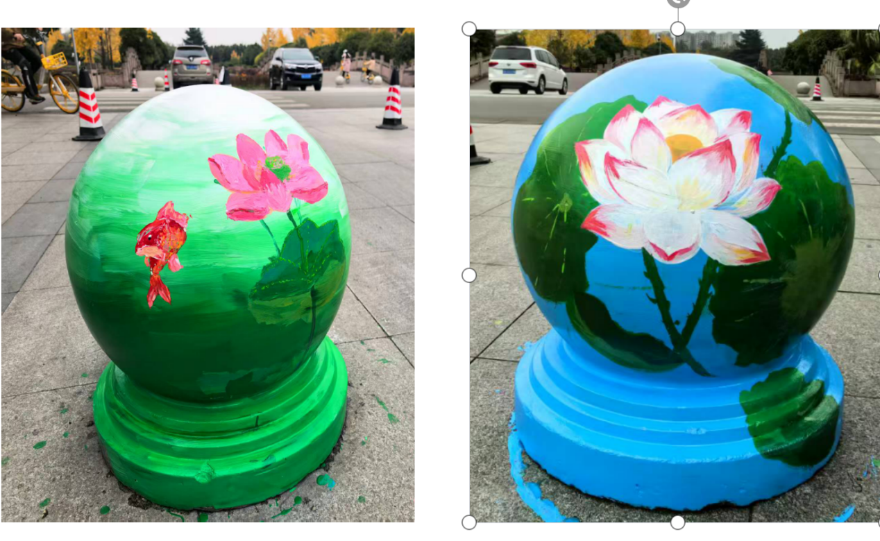 调色盘里的颜料在阳光下发着光,红、粉、绿、白交织成浪漫的色彩矩阵,画笔在石墩上轻轻跳跃,原本冰冷单调的石墩渐渐“活”了起来:有的石墩上,荷花含苞待放,嫩黄的花芯藏在翠绿花萼里,似羞答答的少女;有的石墩上,荷花盛放,层层花瓣簇拥着饱满莲蓬,尽显“小荷才露尖尖角,早有蜻蜓立上头”的诗意;还有的石墩以水墨风绘制,墨色荷叶浓淡相宜,粉色荷花点缀其间,简约却韵味悠长。
