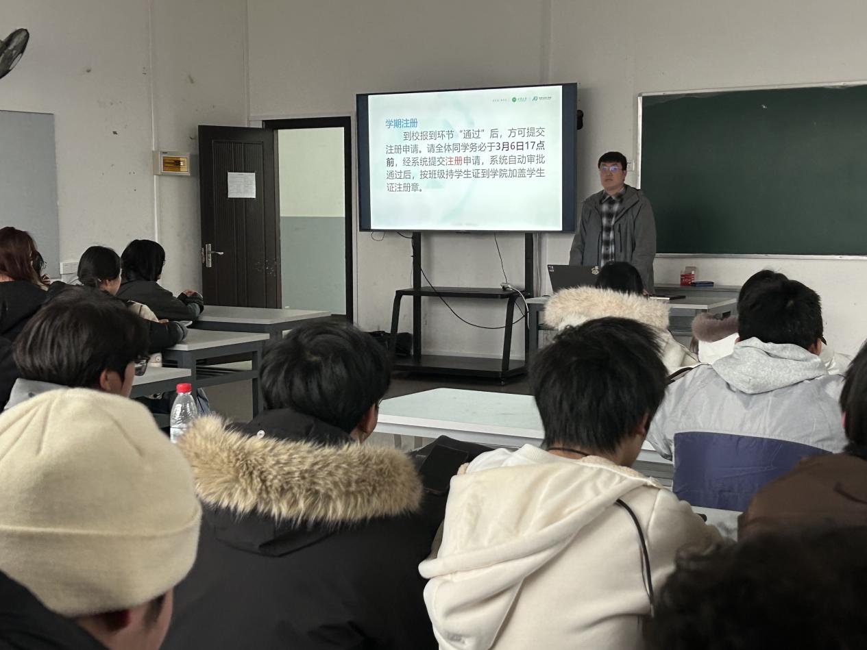 班会伊始,辅导员首先就学期注册事宜进行说明,明确由班长统一收集学生证完成盖章注册,确保全体学生按时完成注册手续。结合上学期学业数据,辅导员对课程成绩、挂科情况进行细致分析,针对部分同学存在的挂科问题,提醒相关学生及时关注补考与重修安排,端正学习态度,诚信应考,自觉遵守考试纪律。