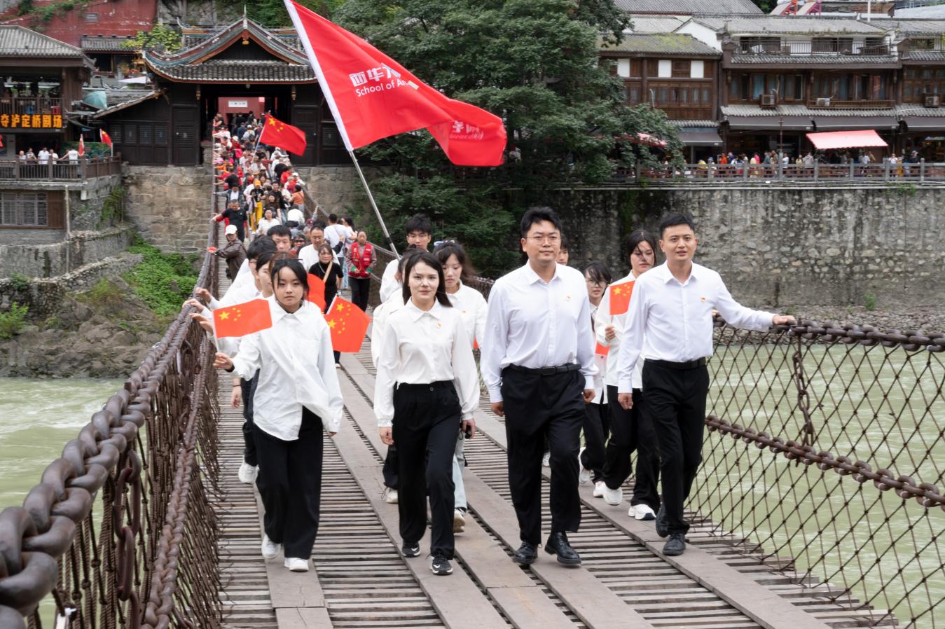 全体师生踏上泸定桥铁索,亲身体验红军飞夺泸定桥的艰险历程。在摇晃的铁索上,师生们围绕桥梁反复行走十余次,深刻感悟革命先辈“攀踏十三寒铁索”的英勇壮举。